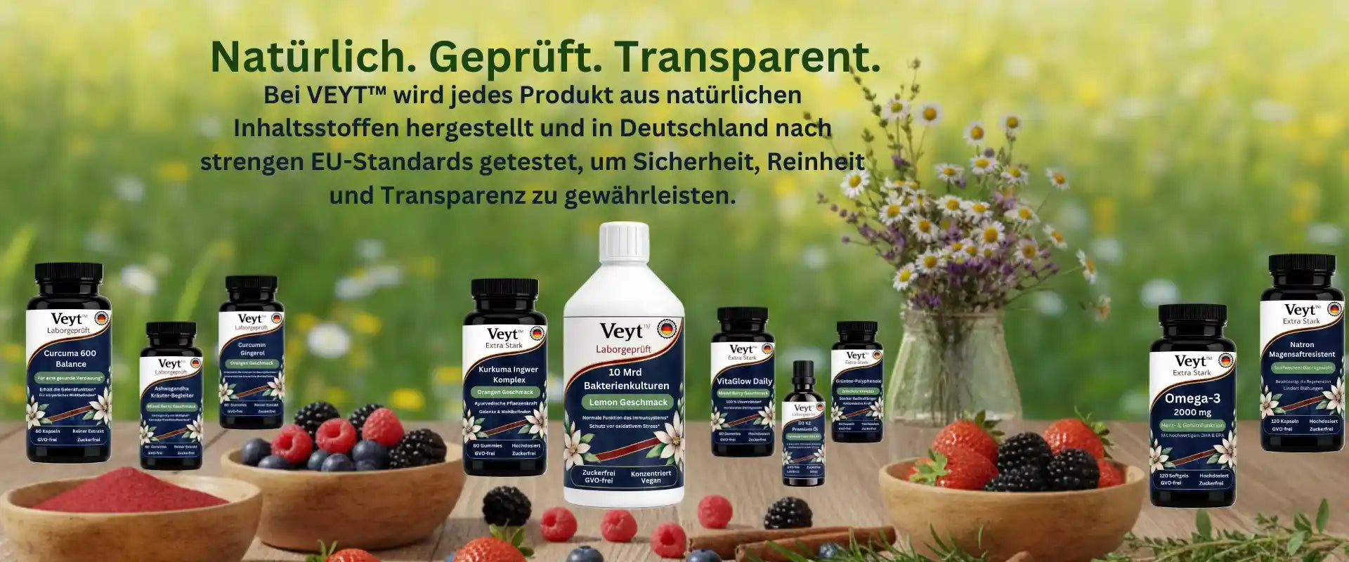 Wir bei Veyt glauben, dass wahre Vitalität mit der Reinheit der Inhaltsstoffe beginnt. Deshalb stecken wir unsere gesamte Leidenschaft und Sorgfalt in jedes einzelne Fruchtgummi, jedes Pulver und jede Kapsel – denn Ihr Wohlbefinden ist unsere größte Motivation. Wir sind uns sicher, dass Sie den Unterschied nicht nur bemerken, sondern lieben werden.