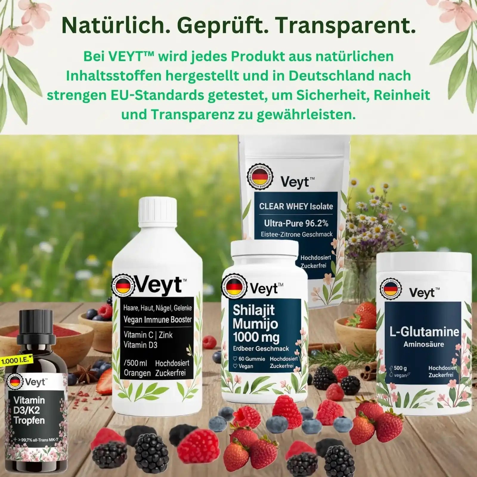 Bei Veyt ist Reinheit nicht nur ein Versprechen, es ist unser Engagement für Ihr Wohlbefinden. Jede Formel wird sorgfältig aus natürlich gewonnenen Zutaten hergestellt, die für ihre spürbaren Vorteile ausgewählt wurden. Jede Charge wird in unabhängigen Laboren in Deutschland gründlich getestet, damit Sie sicher sein können, dass jedes Detail rein, wirksam und sicher ist.
